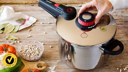 Por qué la hemos elegido: es una olla a presión de 7,5 litros que destaca principalmente por su seguridad y por contar con un diseño robusto (pesa casi 4 kilos). Fabricada en acero inoxidable, es apta para todo tipo de cocinas, incluidas las de inducción, y puede lavarse en el lavavajillas, lo que simplifica su limpieza tras cada uso.