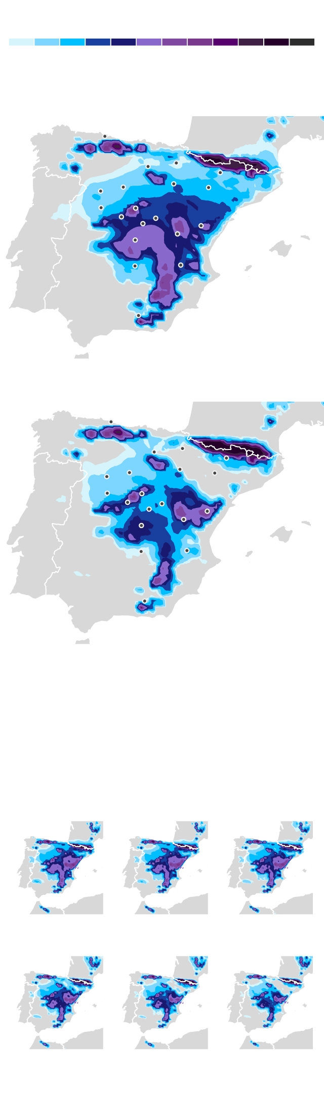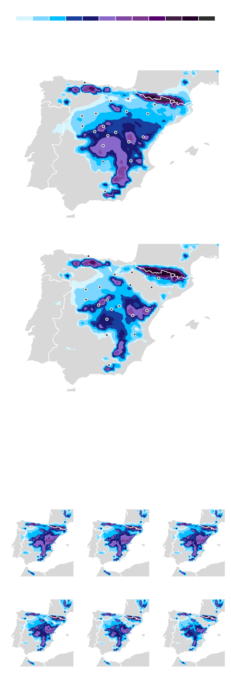 En España no existen muchos precedentes de nevadas tan copiosas. Del Campo explica que una nevada tan intensa solo es común en España “en zonas de montaña, por ejemplo, a partir de 800 metros, en los Pirineos o la cordillera Cantábrica con situaciones potentes de vientos del norte”. En otras ocasiones, han sido borrascas mediterráneas las que han provocado importantes nevadas en el interior oriental peninsular. Así ocurrió en enero de 2020 con la borrasca Gloria.
