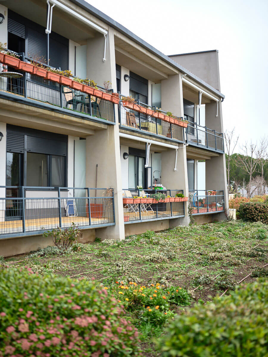 Los habitantes de Trabensol quisieron que sus casas aprovechasen y respetasen la naturaleza que les iba a rodear. Describen la relación con su arquitecto como constructiva y atípica, de mutua escucha. Los apartamentos miran al sur y reciben más horas de luz en invierno. Por el contrario, en verano se mantienen frescos por el plano vertical de los rayos. “Es un edificio bioclimático”, continúa Jaime, “de poco impacto medioambiental, económico de mantener y adaptado para sillas de ruedas”. El agua de lluvia se recoge en un aljibe para el riego del huerto. Y 25 pozos de 150 metros de profundidad permiten mantener la temperatura alrededor de los 16 grados.
