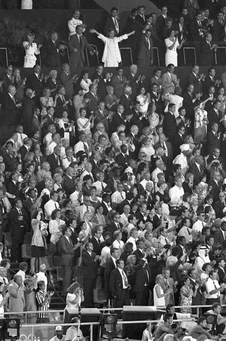 Doña Sofía celebra en el palco con los brazos en cruz el desfile del equipo español con su hijo, el príncipe Felipe como abanderado, en la ceremonia de inauguración.