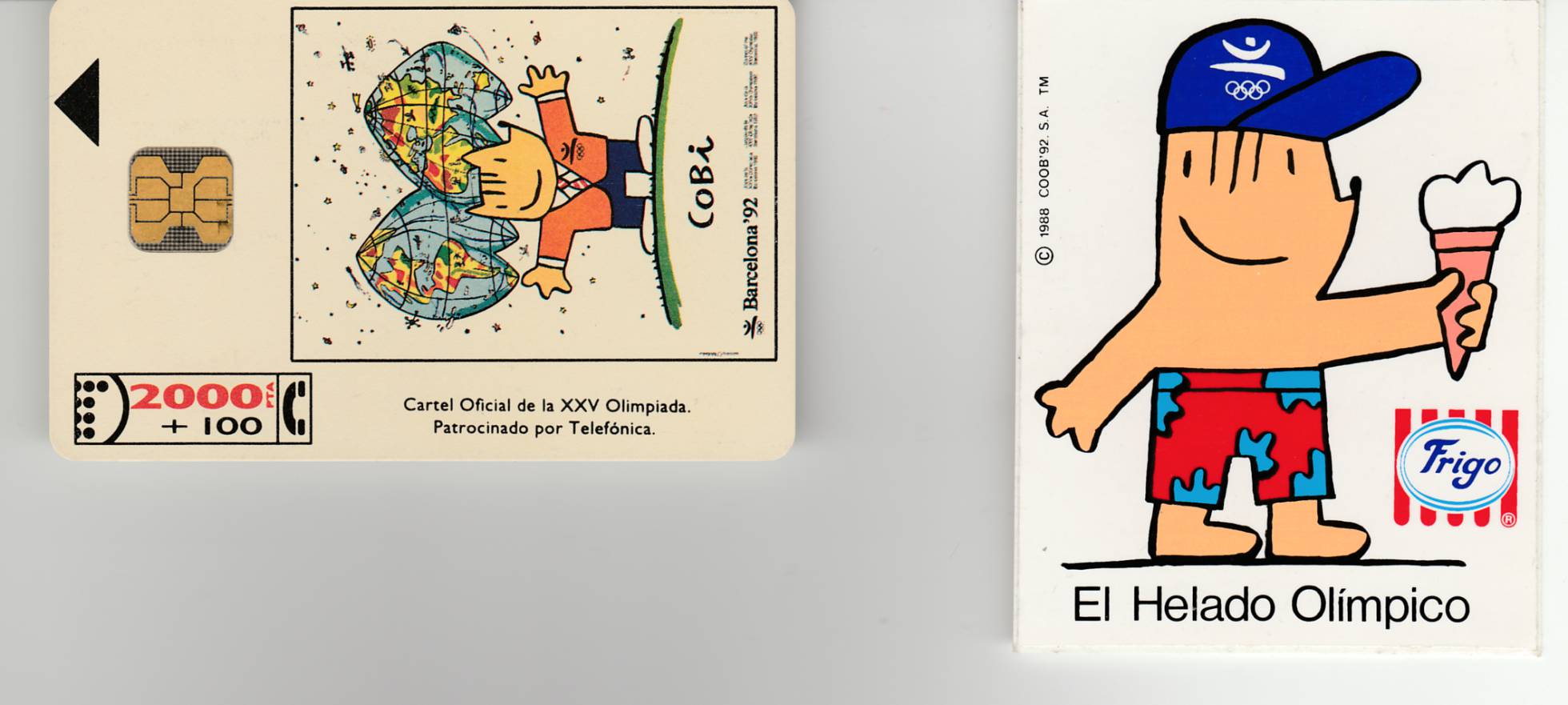 Una tarjeta telefónica y una pegatina de los Juegos.