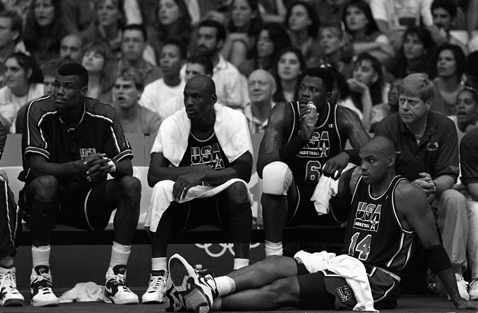 De izquierda a derecha, Robinson, Jordan, Pat Ewing y Barkley contemplan un momento del Estados Unidos (103)-Croacia (70), Un partido espectacular a pesar de los 33 puntos de diferencia, en el que Magic Johnson sufrió una lesión de rodilla y el croata Petrovic lució con luz propia. Fue un ensayo de la final jugada el 8 de agosto. El Dream Team fue oro y Croacia, plata.