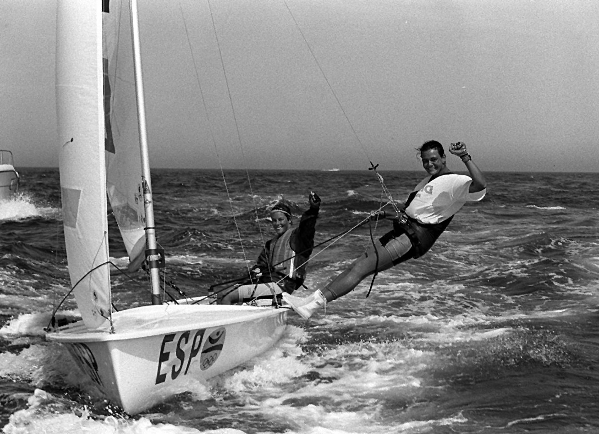Theresa Zabell (a la izquierda) y Patricia Guerra celebran la medalla de oro en la clase 470 femenina de los Juegos Olímpicos de Barcelona.