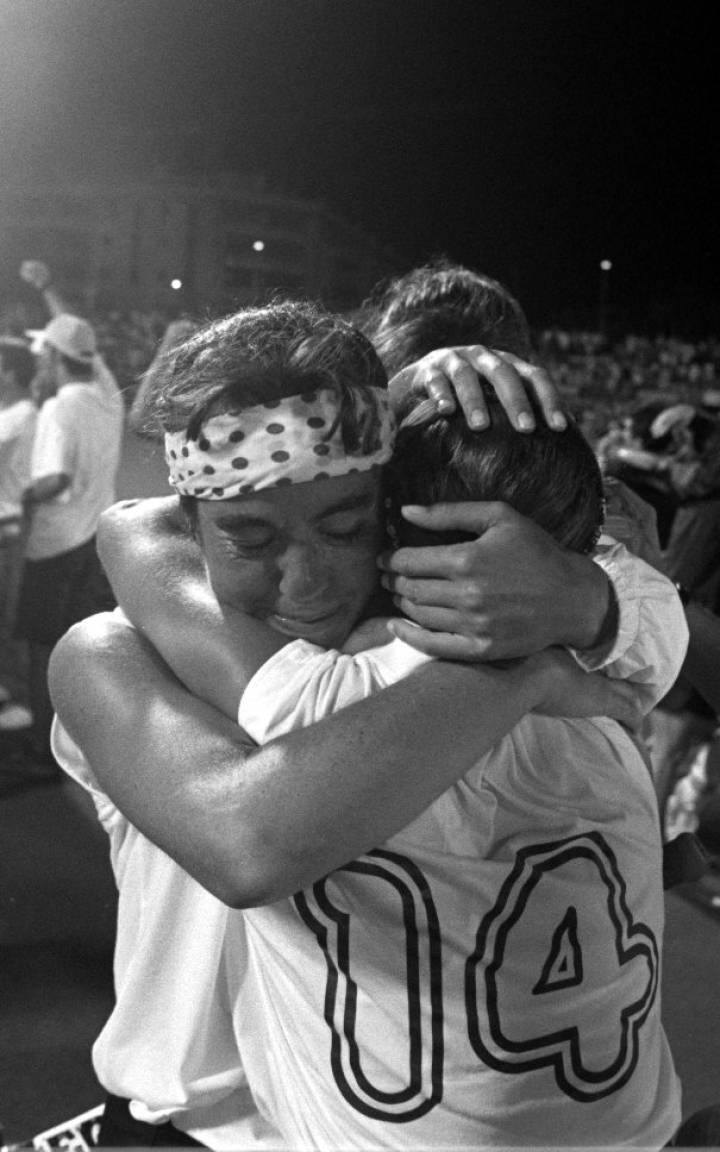 Las jugadoras del equipo español de hockey celebran el gol que les daba el triunfo ante Corea del Sur a dos minutos del final de la prórroga, en los Juegos Olímpicos de Barcelona 1992. La victoria les permite jugar contra Alemania en la final. .