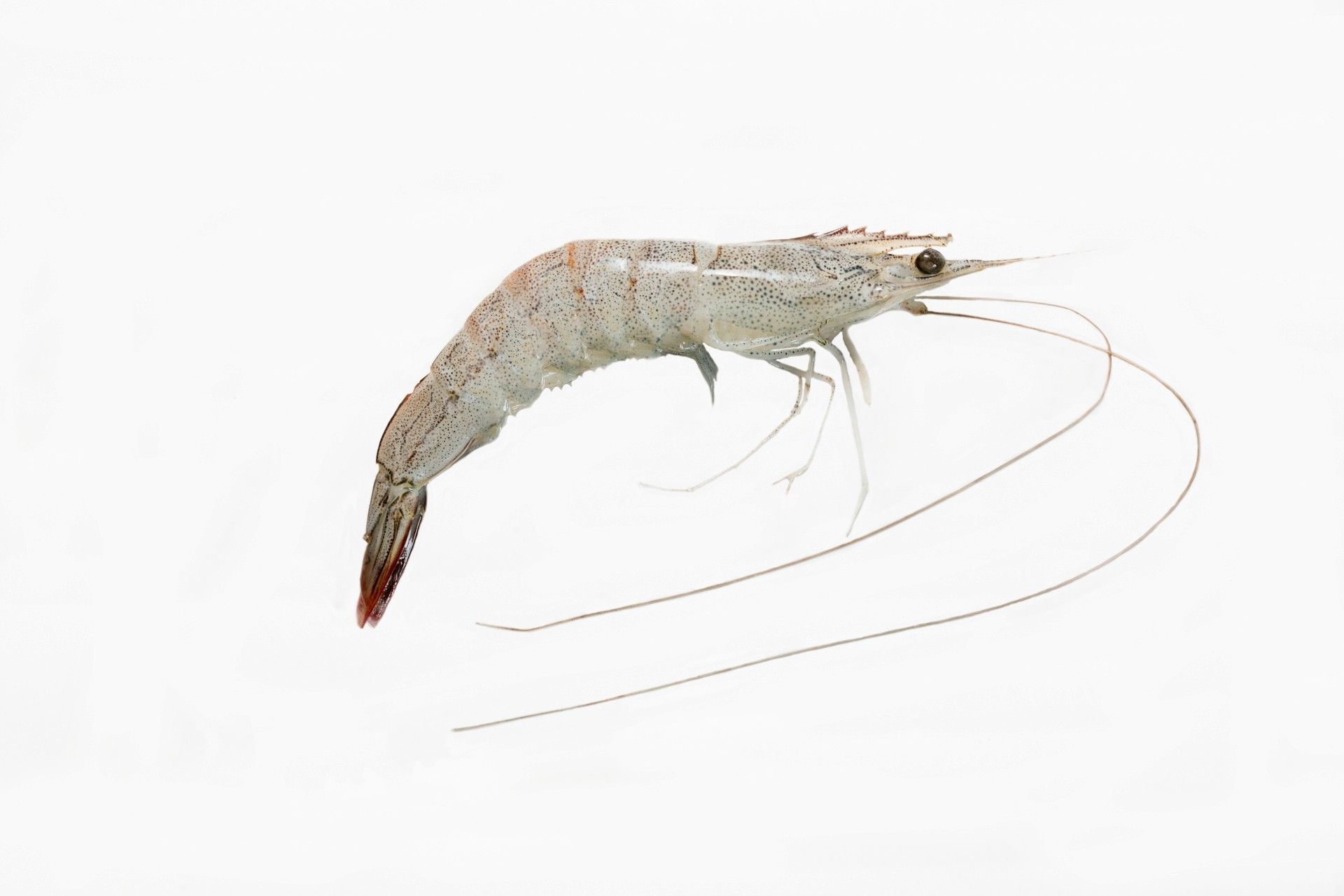 El Penaeus vannamei (camarón patiblanco) es una especie tropical de gamba que se cría generalmente en el sudeste de Asia y en Centroamérica junto con el Penaeus monodon (langostino jumbo). Indonesia, 2016.