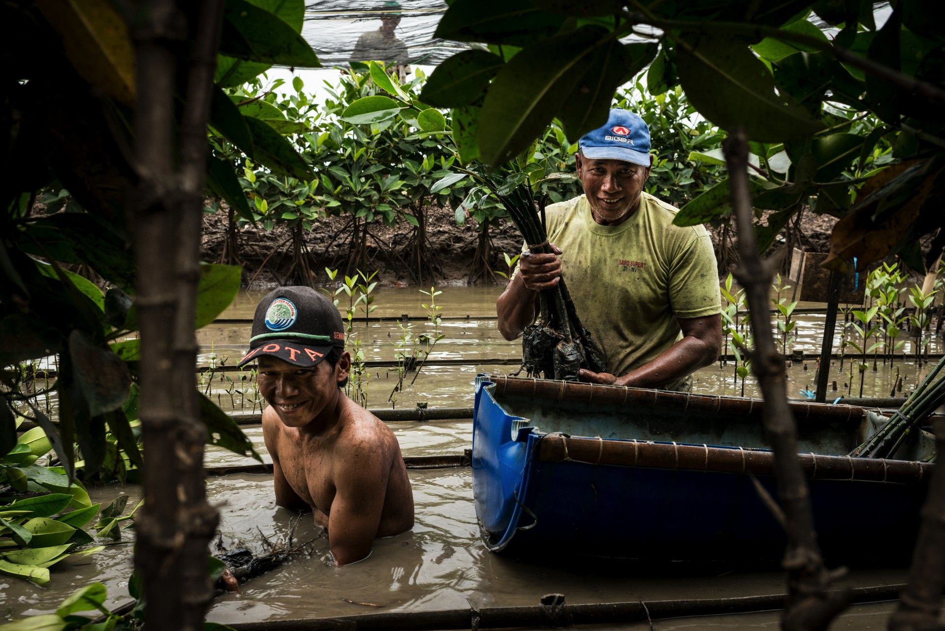 Voluntarios de Mangrove Lestari, una asociación fundada por Sururi, de 58 años, que trabaja en la plantación de mangles del pueblo de Mangunharjo. Los árboles de un año se recogen y se venden a los lugares que necesitan recuperar el bosque litoral. Semarang, Java, Indonesia, 2014.
