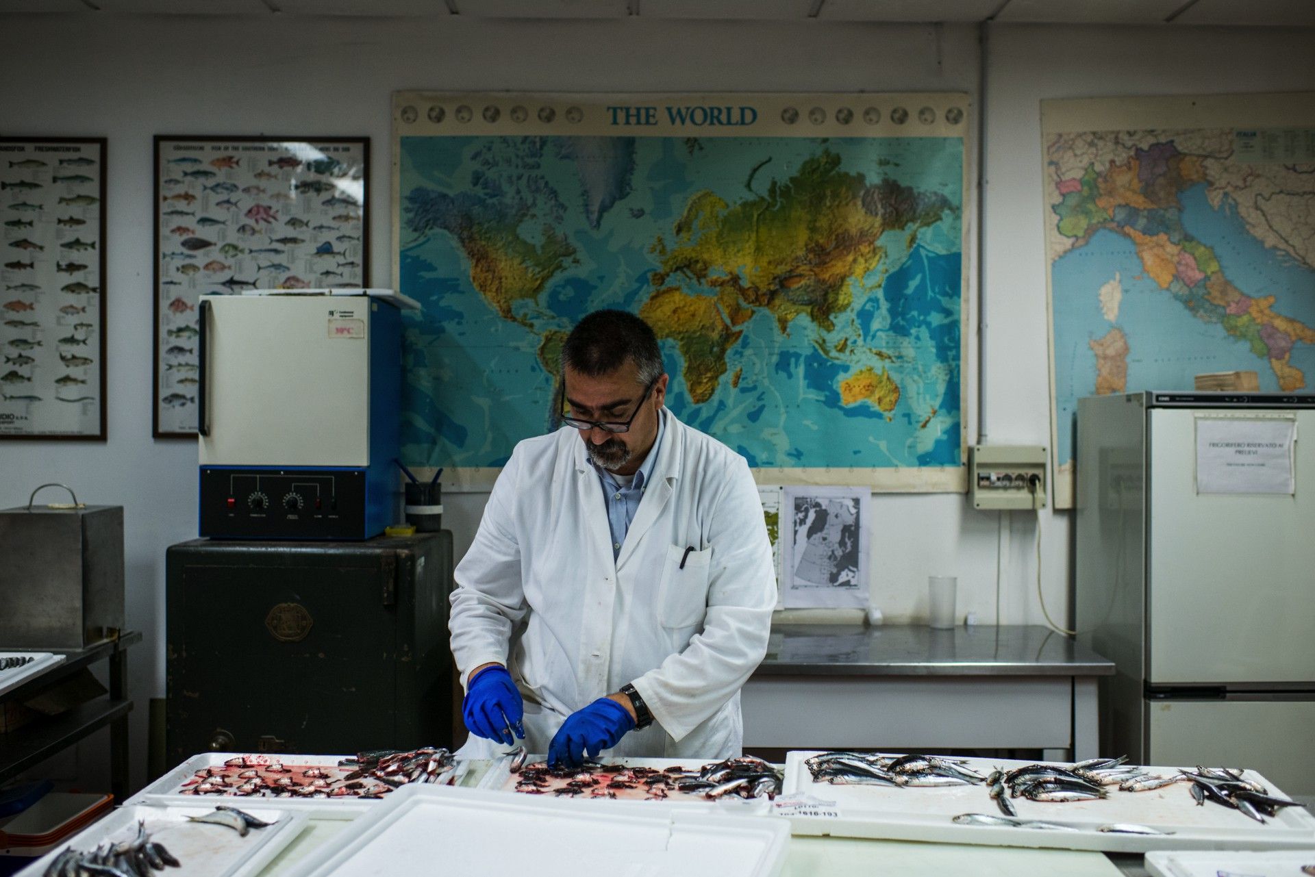 Valerio Ranghieri, veterinario del mercado de pescado de Milán, lleva a cabo una inspección sanitaria diaria de los productos pesqueros. Milán, Italia, 2016.