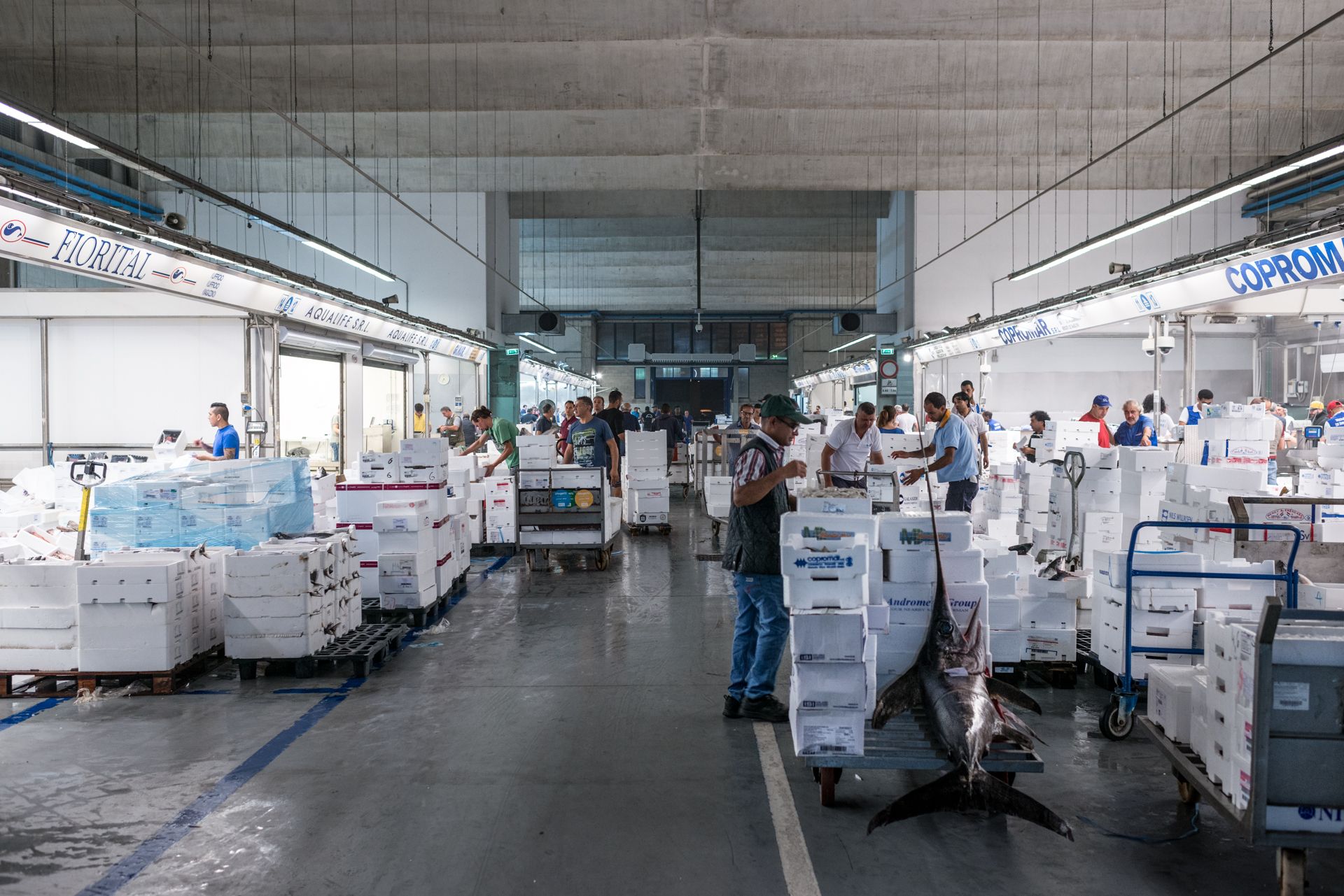 Trabajadores del mercado de pescado de Milán durante la venta matutina. Milán, Italia, 2016.