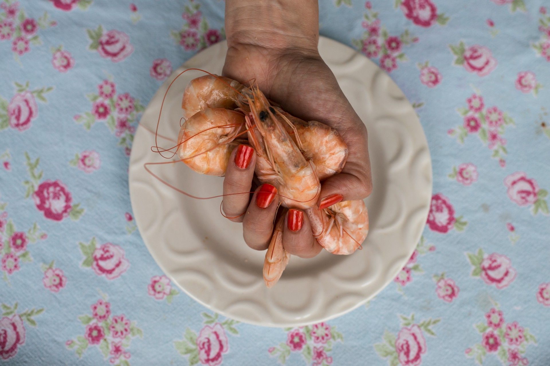 Unas cuantas gambas tropicales hervidas en una cocina italiana. Se calcula que el impacto, medido en cantidad de dióxido de carbono, derivado de la cría de 100 gramos de la especie Penaeus vannamei en Indonesia, equivale a 1.000 toneladas de CO2. El cálculo no tiene en cuenta el impacto del embalaje y el transporte hasta las mesas europeas. Italia, 2016.