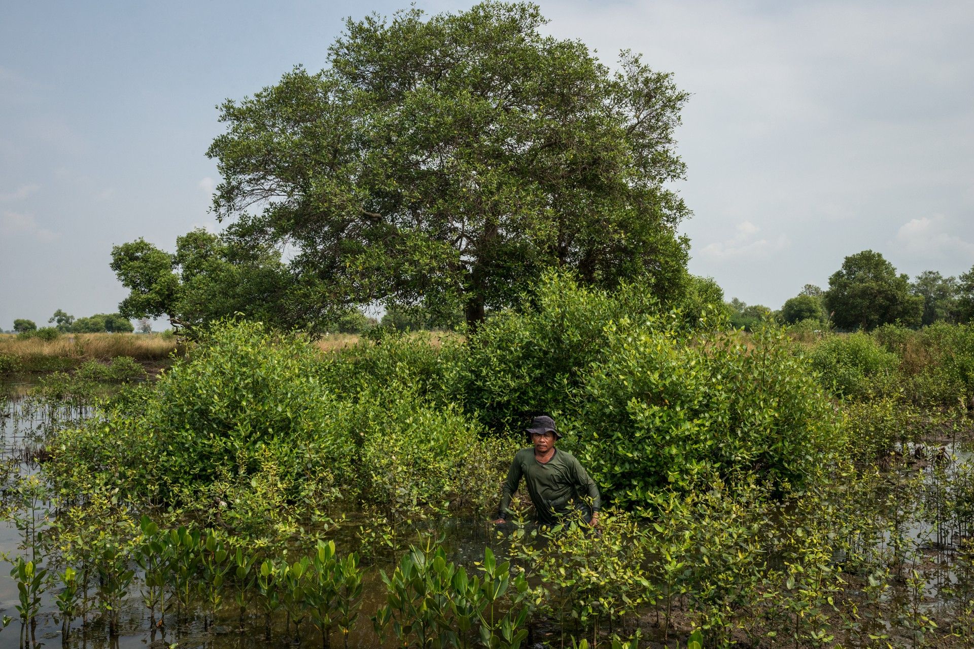 Romdana, de 45 años, un criador del pueblo de Sawah Luhur, con el barro hasta la cadera en su estanque lleno de mangles. Se ha unido al proyecto de recuperación Programa para Indonesia de la ONG Wetlands International. Banten, Java, Indonesia, 2016.