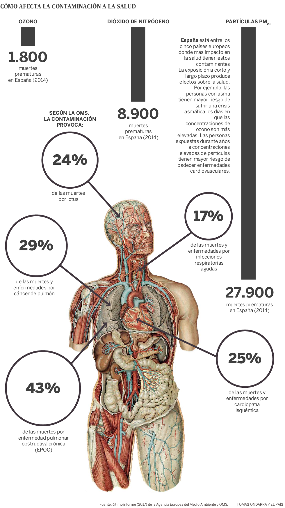 Estudiar los efectos de la exposición a estos agentes nocivos en la salud no es fácil. En los certificados de defunción no aparece la mala calidad del aire como causa de la muerte. Sus efectos son acumulativos, es decir, no hay una relación causa-efecto evidente. Según el último informe anual de la Agencia Europea del Medio Ambiente, en España se produjeron 38.600 muertes prematuras debidas a la contaminación en 2015. La gran mayoría (27.900) fueron atribuibles a las partículas. Distintos estudios han demostrado correlación entre picos de contaminación e ingresos hospitalarios, por ejemplo.