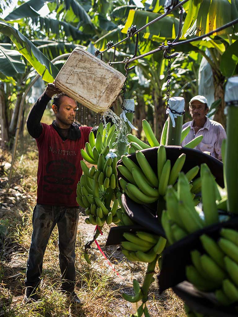 En los perímetros de cada finca, un cableado recorre la plantación. Es el sistema rudimentario que emplean para transportar las bolsas de plátanos, colgadas por ganchos, hacia el lugar donde los lavan y empaquetan. Un hombre escuálido, de 19 años que aparentan 30, se ata bajo la cadera una cuerda que le cruza la espalda. Lleva una camiseta de color café de tirantes que la humedad ha estirado tanto que deja al descubierto su pecho y espalda, tallada por las hendiduras de la cinta. Su trabajo consiste en correr arrastrando las bolsas enganchadas al cable y transportarlas al lugar de destino. Está descalzo. Un trabajo que podría hacerse con un sencillo motor o una bestia de carga. Pero la luz y la comida del animal son más caras que su sueldo.
