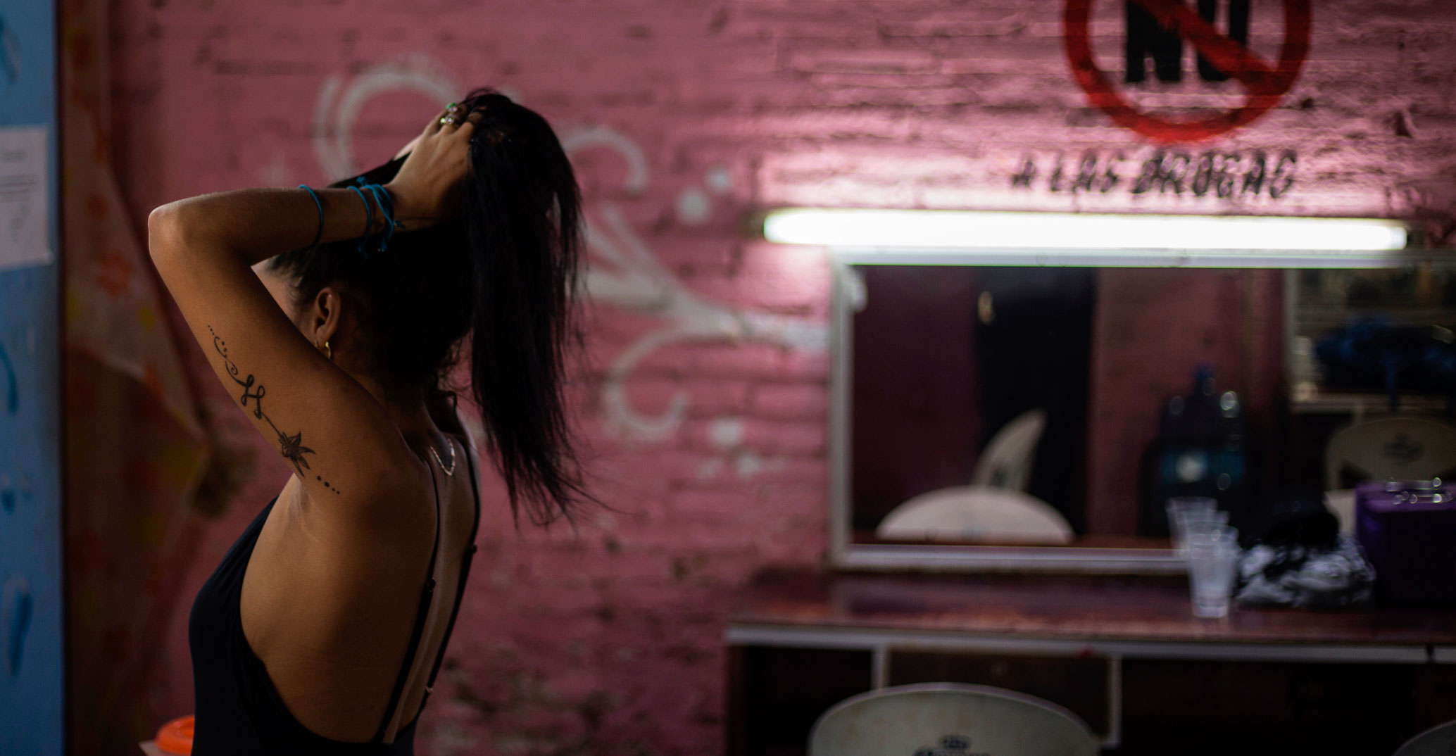 Entran por unas puertas traseras que desembocan en cuartos de ladrillo pintados de rosa y azul celeste. Se desnudan, se maquillan, se peinan, se perfuman con colonias que embriagan el aire con aroma a melocotón, coco y frambuesa. Su tono de voz al cruzar ese umbral también es empalagoso; su sonrisa, complaciente. Ya están trabajando.