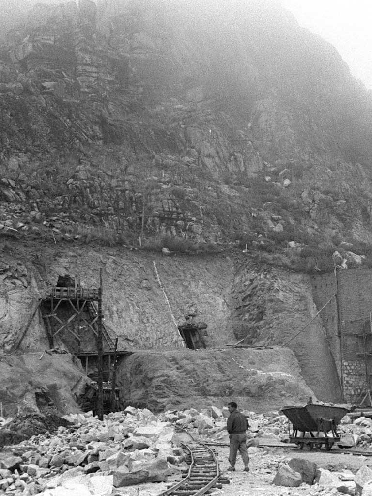 Los accidentes, de distinta gravedad, fueron constantes durante la construcción del monumento, además de los problemas derivados del polvo que tragaban quienes horadaban la piedra de la cripta. No hay cifras oficiales, pero el doctor Ángel Lausín, el encargado de la enfermería, calculó unos 14 muertos. En la imagen, aspecto de las bocas de entrada a las obras de vaciado de la gran cripta de la Basílica del Valle de los Caídos en 1943. / EFE/SVB