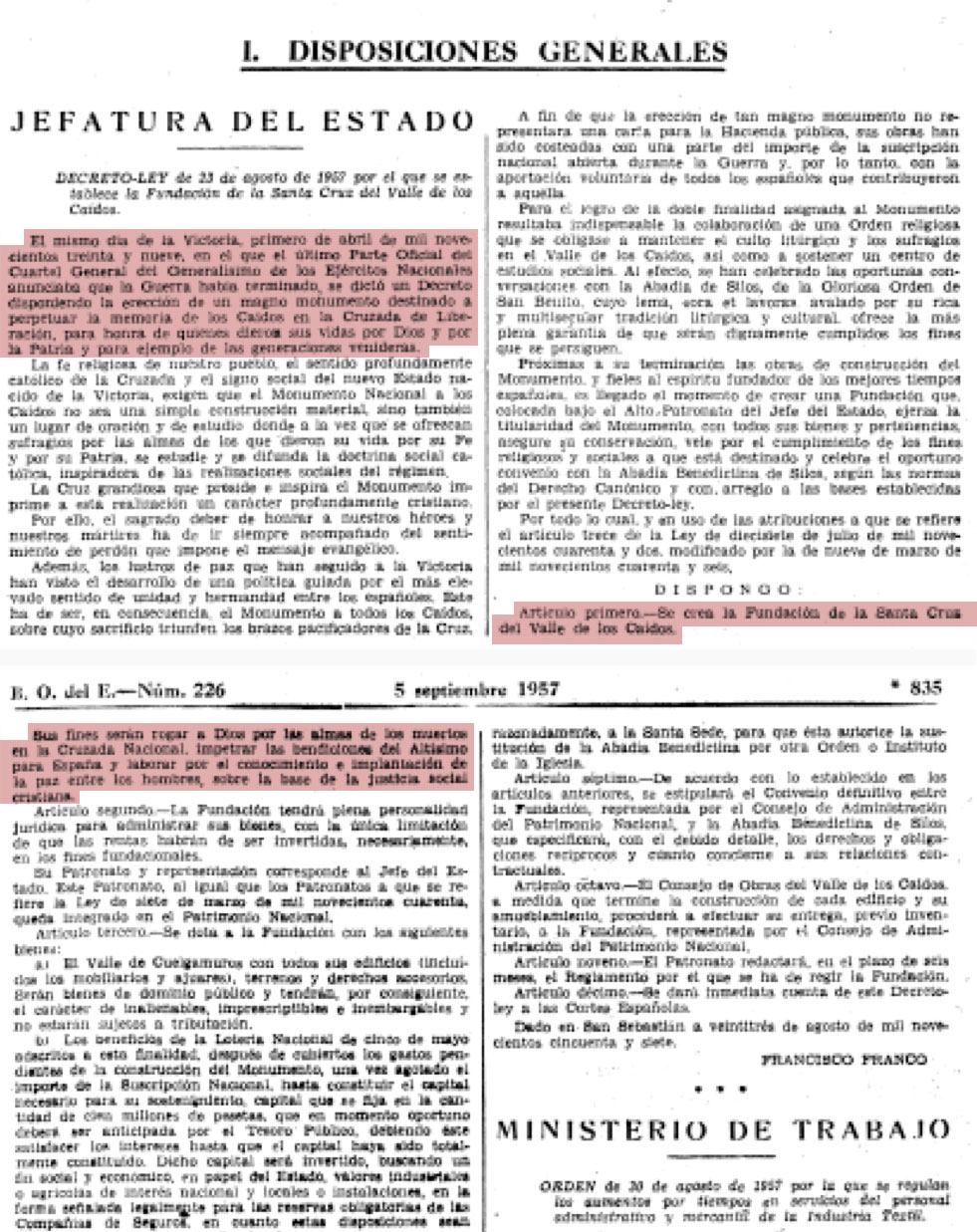 Con los trabajos muy cerca de culminarse, se hacía necesario darle un respaldo jurídico a la administración del conjunto. El decreto ley del 23 de agosto de 1957 atribuye la titularidad del lugar a la Fundación de la Santa Cruz del Valle de los Caídos, a la que dota, además, de unos objetivos muy claros. Pinche en el audio para escucharlos y siga bajando para ver el documento.