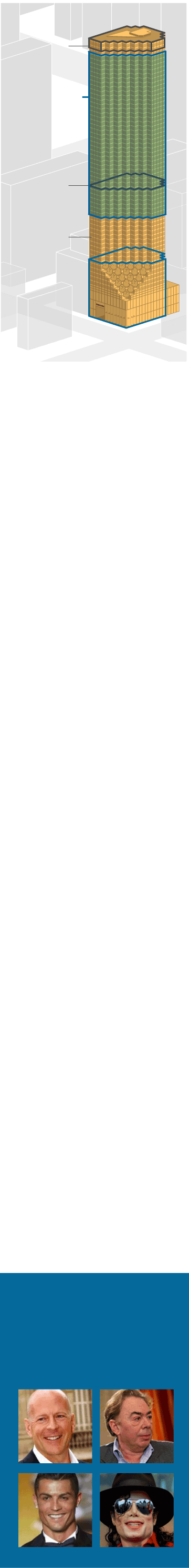 Cristiano Ronaldo compró un apartamento por 18 millones de euros. Otros famosos que se han alojado en la torre han sido: Bruce Willis, Andrew Lloyd Webber, Michael Jackson.
