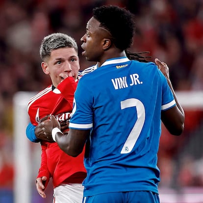 ¿Qué pasó? Las imágenes del encuentro Benfica-Real Madrid muestran al futbolista argentino tapándose la boca con la camiseta en reiteradas ocasiones mientras se dirige a Vinicius.