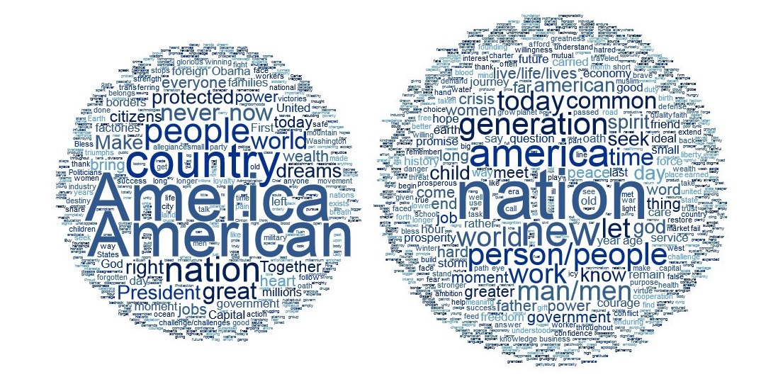 El nuevo presidente se regodeó en el uso de America, estadounidense (American o Americans) y país, en contraste con el primer discurso de investidura de Barack Obama, que insistió en el uso de nación, de nuevo América y luego gente.