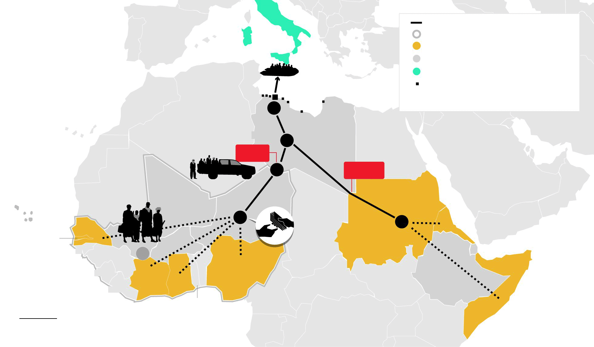 Los migrantes de la principal ruta africana —la del oeste— son en su mayoría de Nigeria, Costa de Marfil, Ghana y Gambia. Estos países forman parte, junto a otros 11, de la ECOWAS, que establece una suerte de espacio Schengen africano y por el cual se mueven libremente a través de sus fronteras. Los migrantes pagan de forma totalmente legal el viaje en autobús regular (unos 20 euros) con destino a Agadez (Níger), el núcleo donde comienza el verdadero negocio de los traficantes.