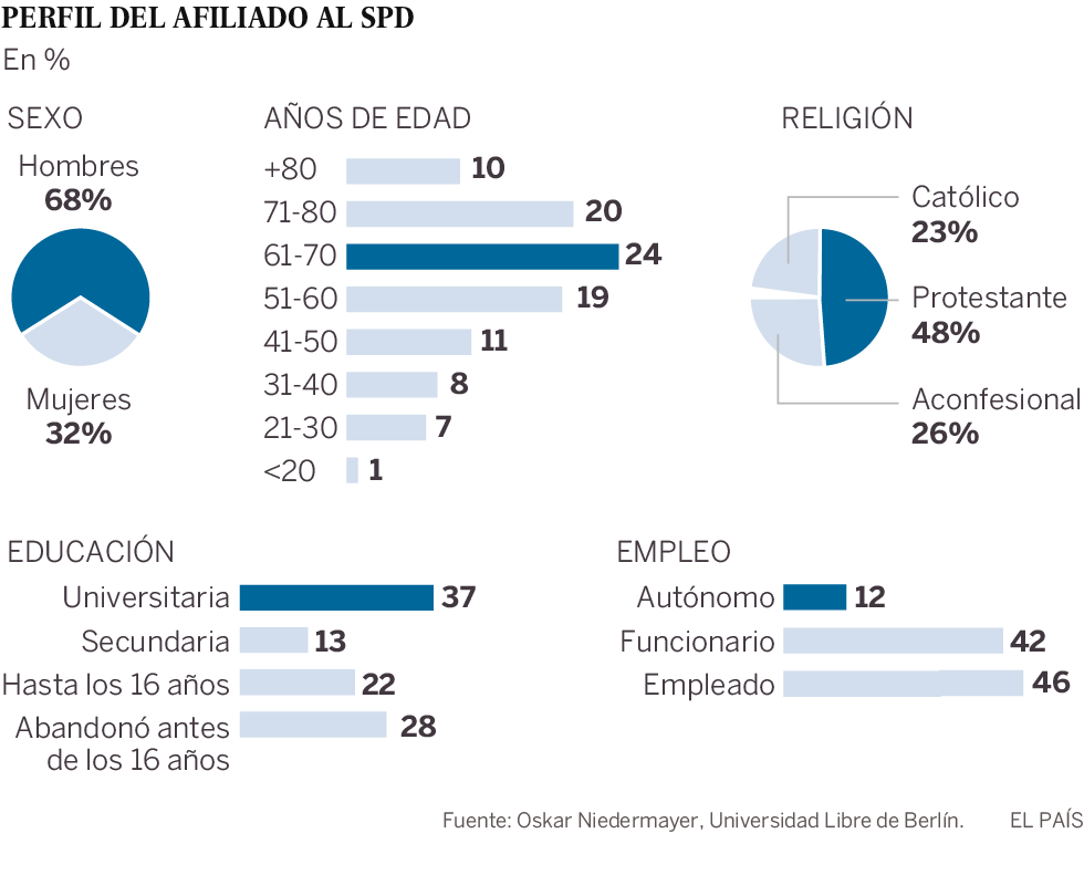 La dirección del SPD defiende ahora una alianza, de la que renegó en un principio, pero a la que se ha visto abocada tras colapsar la llamada coalición Jamaica —conservadores, liberales y Verdes— que habría permitido al SPD curar sus heridas electorales cómodamente en la oposición. Pero no ha sido así, y pactar con Merkel se ha convertido en la opción más viable para que Alemania tenga pronto un Gobierno estable. En este escenario, la edad y el perfil socioeconómico de los militantes podría jugar un papel determinante.