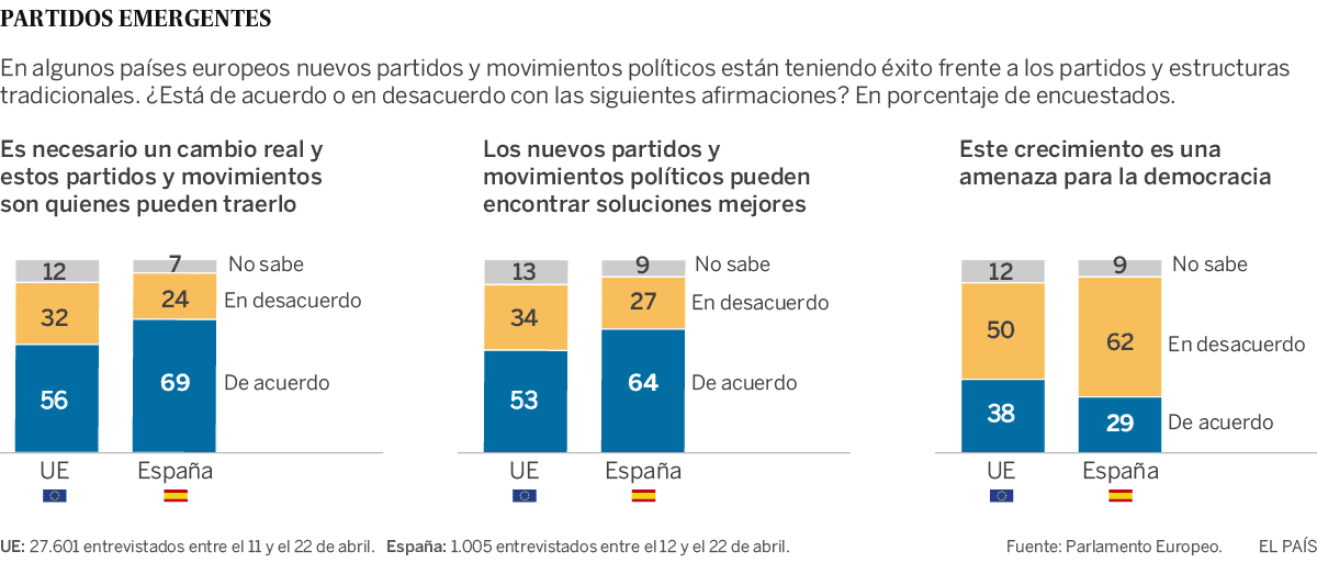 En España, la actitud hacia los nuevos partidos resulta aun más favorable que la media europea. El 69% de los encuestados defiende que estas fuerzas pueden encontrar mejores soluciones a los problemas (la media europea es del 56%). Y solo un 29% (frente al 38% comunitario) percibe su éxito como un peligro para la democracia. El resultado retrata la actual intención de voto: PP y PSOE reúnen a menos de la mitad del electorado.