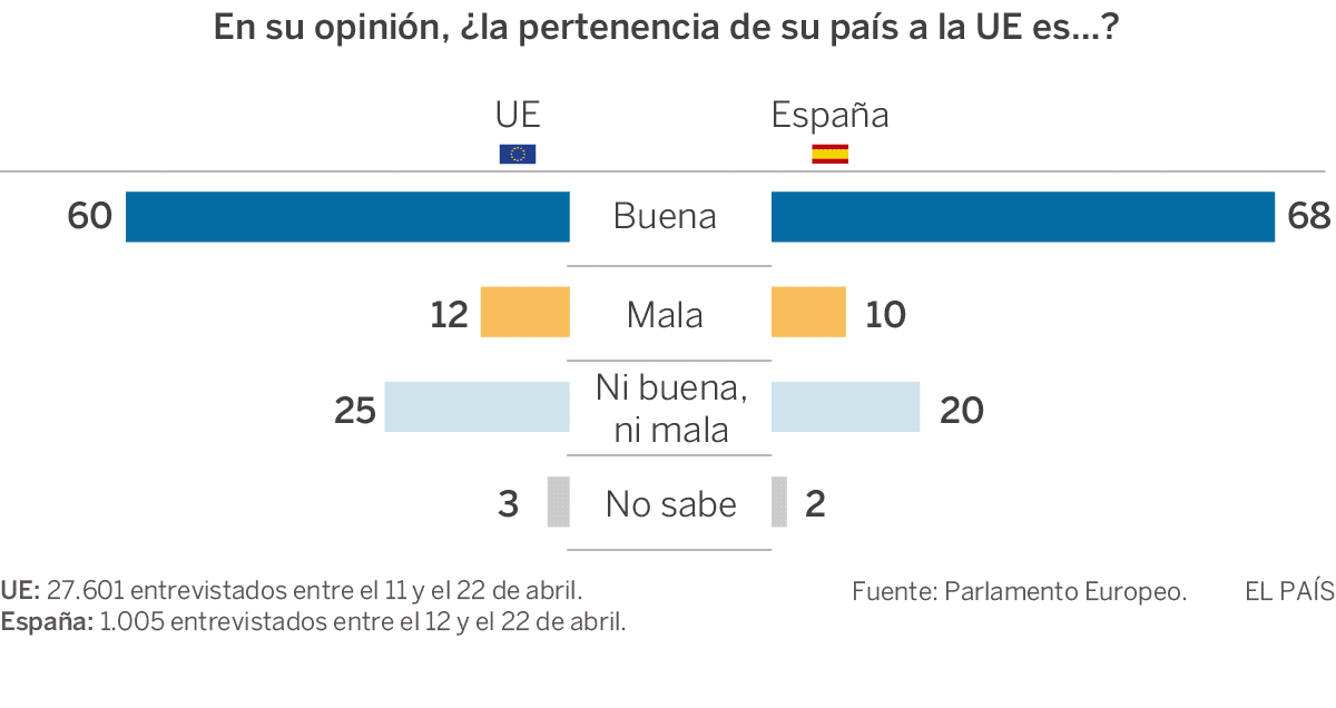 Más de la mitad de los europeos (el 56%) confía en los nuevos partidos frente a las fuerzas tradicionales. A un año de las elecciones en la UE, el Eurobarómetro 2018 sobre el Parlamento Europeo revela una mayor confianza en las formaciones que se apartan del bipartidismo. La mitad de los ciudadanos niega que estas corrientes amenacen la democracia, aunque el concepto de partido nuevo no necesariamente equivale a antisistema (incluye, por ejemplo, al partido de Emmanuel Macron en Francia). Pese al deseo de cambio, la inmensa mayoría respalda la pertenencia al club comunitario, con un 67% que la considera beneficiosa para su país, según los datos de la encuesta divulgada este miércoles. Se trata del mejor resultado desde 1983.