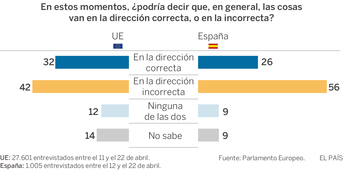 Aun así, las dudas sobre cómo funciona el engranaje de Bruselas son más que residuales. “Es chocante ver cómo cuatro de los cinco grandes países de la UE (Reino Unido, Francia, España e Italia) muestran un nivel significativamente bajo de satisfacción con el funcionamiento de la democracia en la UE”, señala el Eurobarómetro. En esos Estados, apenas el 40% de las respuestas son positivas.