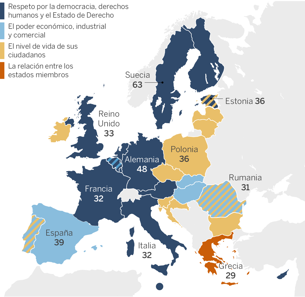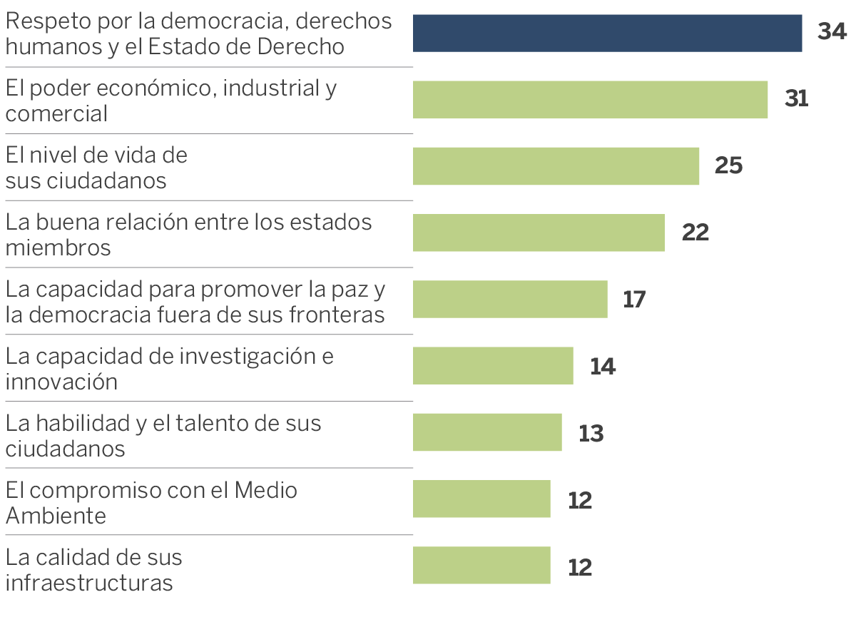 Una encuesta del Eurobarómetro de finales de 2018 daba un resultado quizá sorprendente para algunos. Preguntados por cuál es el mayor activo de la UE, los 27.000 encuestados optaron en primer lugar por “el respeto de la democracia, del Estado de derecho y de los derechos humanos”. Solo después vinieron conceptos como “la potencia económica, comercial e industrial” del conjunto o “el nivel de vida de los ciudadanos europeos” (aunque, si se desglosa por regiones, estos últimos dos valores son dominantes en el Este).