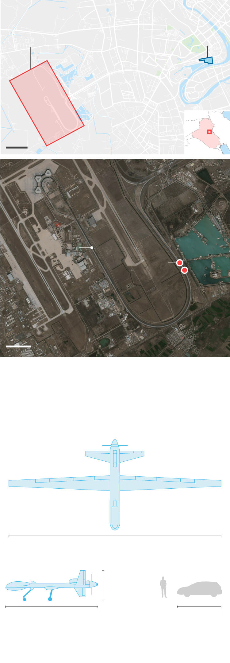 El ataque se ejecutó con misiles lanzados desde un dron MQ-9 Reaper, según fuentes de Washington. Soleimani, a quien muchos expertos consideraban como la persona más poderosa de su país después del ayatolá Jamenei, acababa de desembarcar de un avión procedente de Siria o de Líbano, acompañado de Mohammed Ridh, relaciones públicas del aparato de milicias proiraníes conocido como Fuerzas de Movilización Popular (FMP).