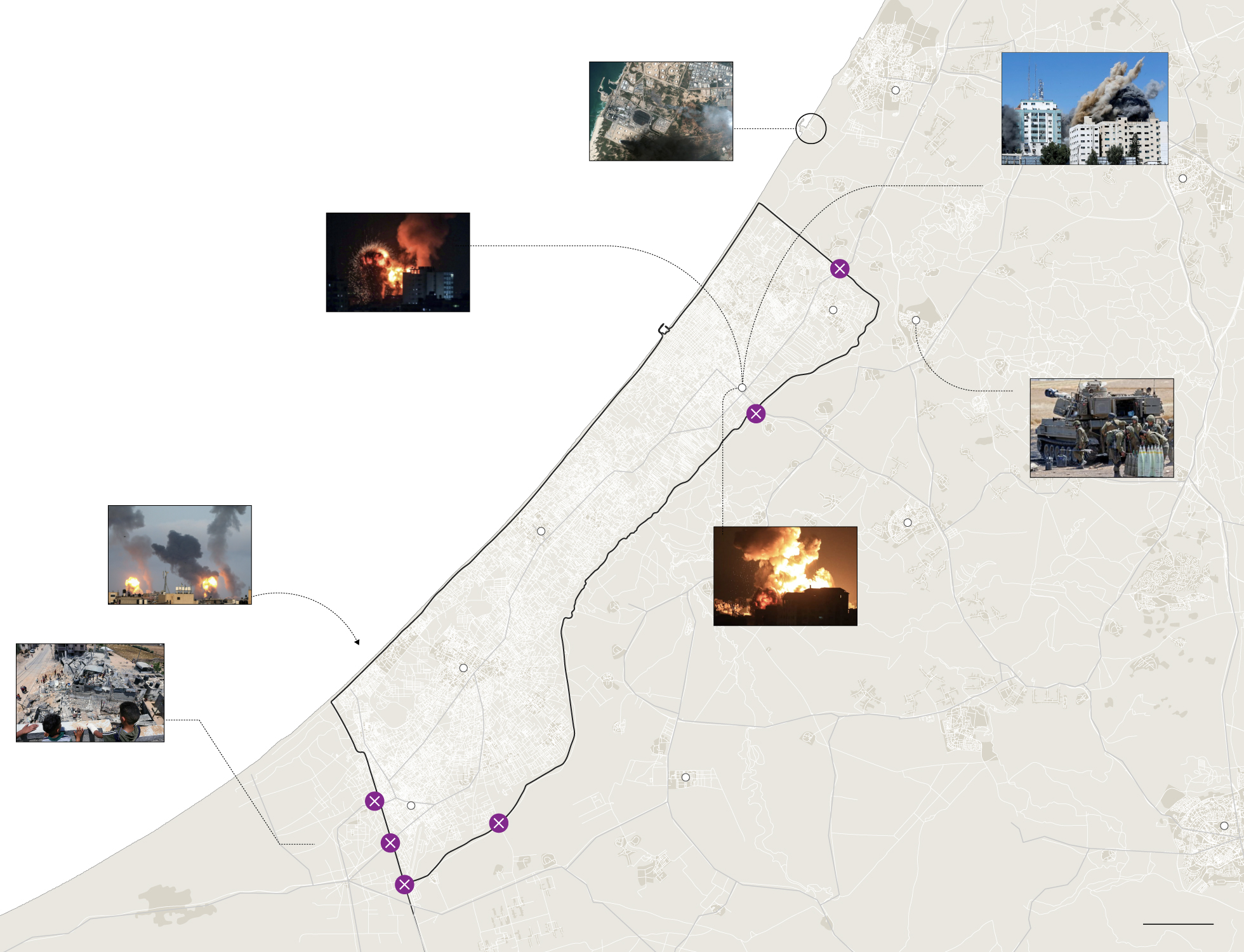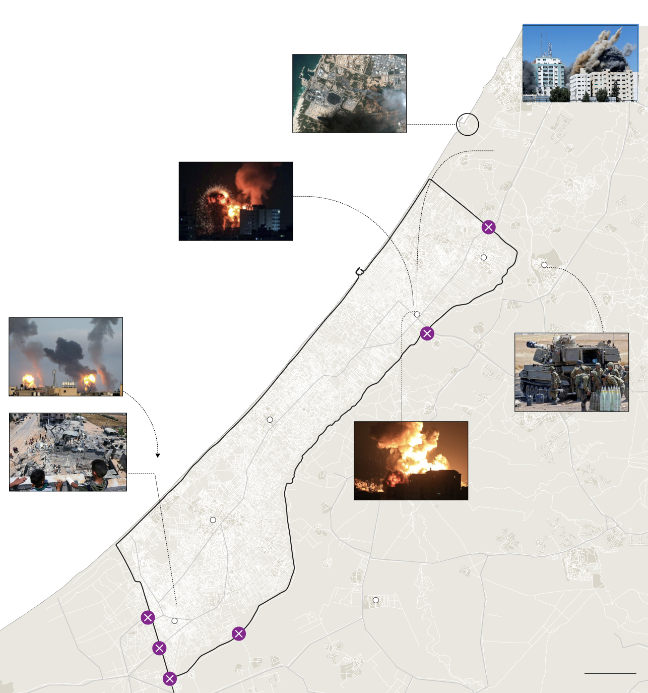 Las operaciones militares israelíes arrasaron edificios en Gaza que, según el Ejército, albergaban a partidos y milicias palestinas. Medio centenar de inmuebles fueron destruidos por la aviación israelí, durante una jornada que estuvo marcada por el asesinato selectivo de líderes de Hamás y la Yihad Islámica. Drones y cazas de la fuerza aérea acabaron con la vida de Bassem Issam, comandante de las Brigadas Ezzedin Al Qassam, brazo militar de Hamás, en la ciudad de Gaza, y a otros jefes de unidades y directores técnicos de la producción y lanzamiento de cohetes, así como a Hasan Kaogi, responsable del servicio de contraespionaje en la Franja. Según el Ejército israelí, la aviación alcanzó los domicilios del comandante de Jan Yunis (en el sur del enclave), Rafah Salameh, y del jefe del aparato de espionaje de la milicia, Mohamed Yizuri.