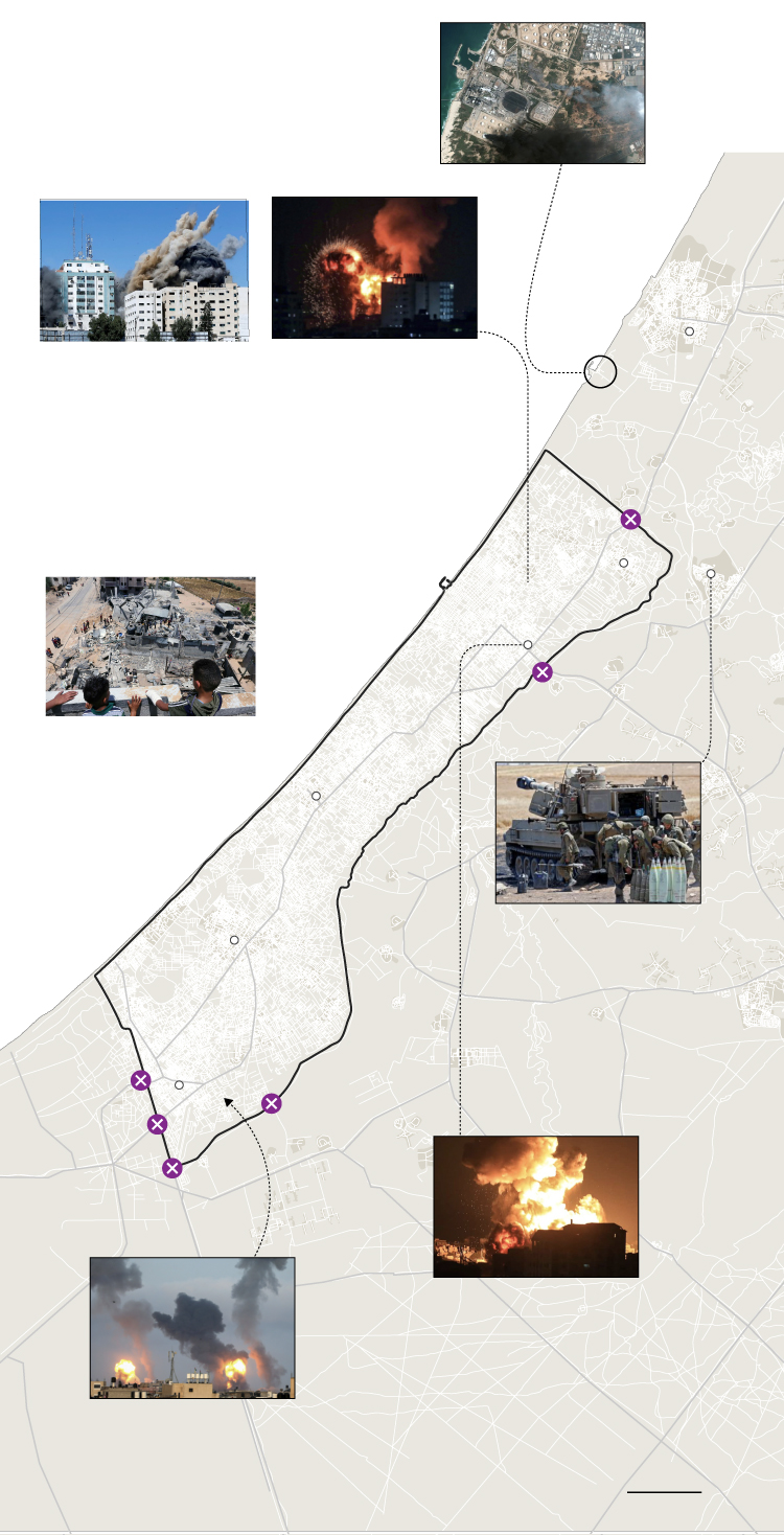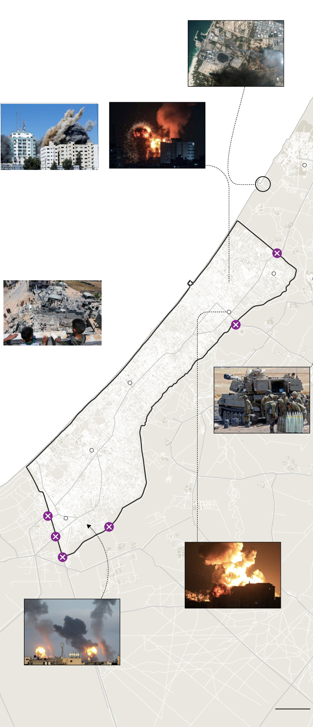 Israel da un paso más en la ofensiva y lanza una operación aérea y de artillería a gran escala contra Gaza, sin precedentes desde la guerra de 2014. El objetivo, según fuentes militares, era la red de túneles subterráneos por la que se desplazan los combatientes de Hamás hasta las rampas de lanzamiento de cohetes y los puestos de ataque en las proximidades de la frontera con Israel. En la denominada Operación Guardián de los Muros, más de 550 andanadas de disparos de la artillería se sumaron a los bombardeos masivos de 160 aviones de combate con 450 misiles contra más de 150 posiciones de las milicias gazatíes. Desde el inicio de las hostilidades, al menos 145 palestinos han muerto —entre milicianos y civiles— y más de 800 personas han resultado heridas, según las autoridades palestinas.