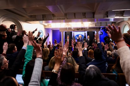 Antes de su aparición en escena, la Casa Blanca había atenuado las luces de la sala de prensa, en la que los reporteros esperaban con expectación la intervención anunciada de urgencia. El drama anticipado por ese gesto llegó pronto. El presidente −que habló airado entre el secretario de Comercio, Howard Lutnick, y el abogado de la Administración que litigó el caso de los aranceles ante el Supremo, John Sauer− no perdió tiempo para arremeter una y otra vez, en una violación flagrante de la separación de poderes, contra los magistrados que no le dieron la razón, a los que llamó “perros falderos de la izquierda radical”. Al rato, extendió a “sus familias” la vergüenza que dijo que debían sentir. También definió la sentencia como “profundamente decepcionante”.