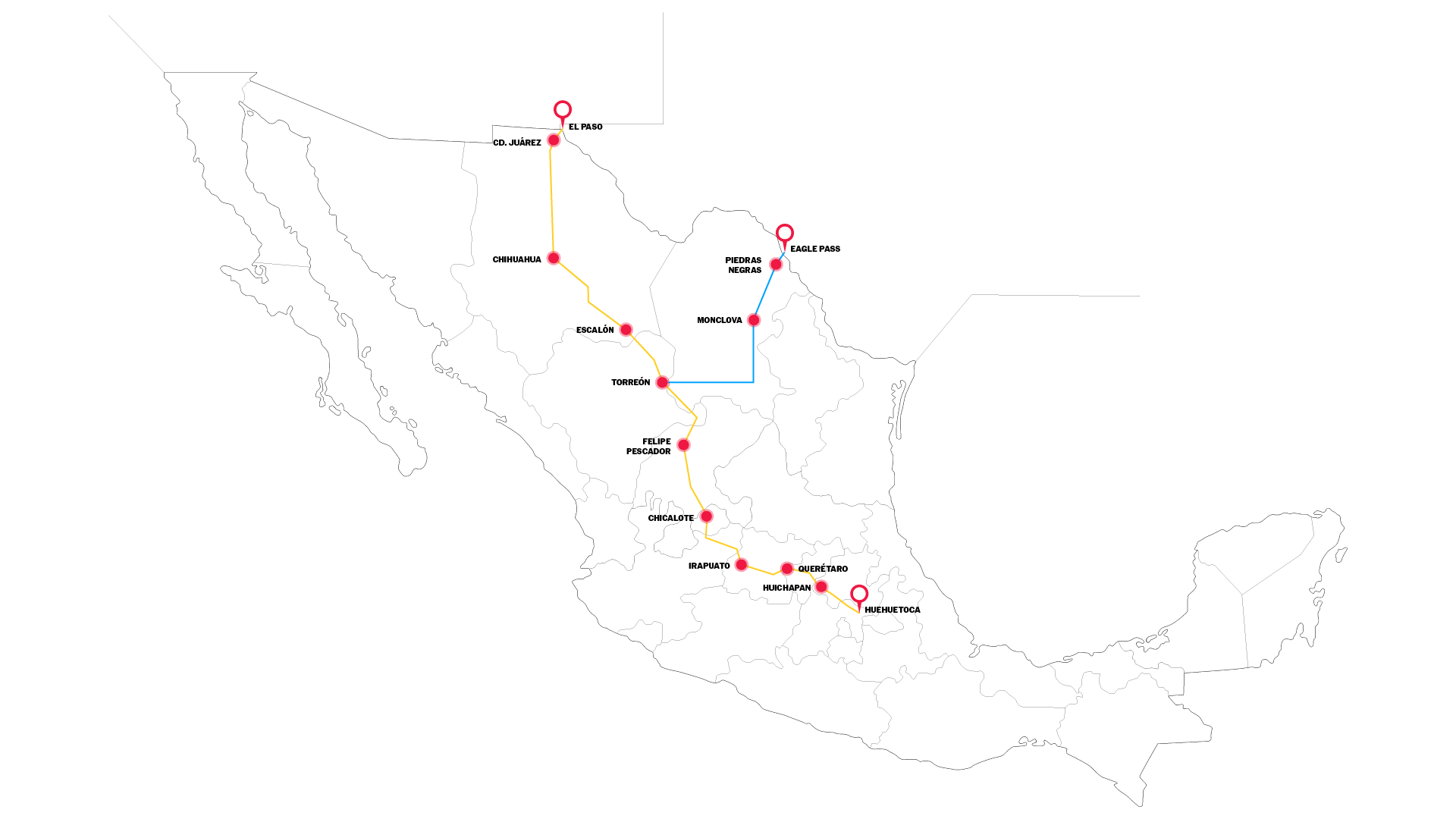 El 19 de septiembre, el grupo Ferromex de don Germán Larrea inmovilizó 60 trenes harto de los migrantes que se subían a ellos como bandadas de estorninos y de las noticias de muertes y mutilaciones. Las continuas olas migratorias experimentaban esos días una crecida de tsunami. Con los autobuses en manos de las mafias, el tren se ha convertido en una opción más segura y rápida para ir pasando de pantalla. De Huehuetoca a Huichapán, de ahí a Querétaro, San Luis, Monterrey, Torreón y Piedras Negras. O quizá Torreón, Chihuahua y Ciudad Juárez. Nada es sencillo ni aparta el peligro. Con suerte, el trayecto es continuo y no hay que huir de la Migra en cada estación, ni de los delincuentes que frenan el tren para robar mercancías o poner precio a la vida de los migrantes.