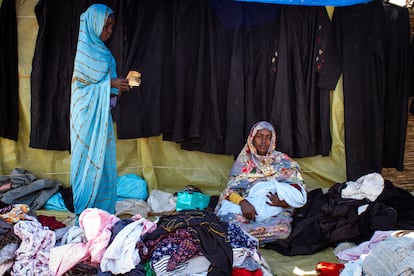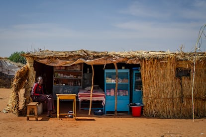 Para otras, el comercio es la única alternativa. Salima Hamed Souliman vende ropa bajo el toldo de su tenderete. Llegó en 2023 desde Darfur con algunos ahorros que le dieron para adquirir las primeras prendas. A veces come una vez al día, a veces dos, porque el negocio no da para más. “Depende de lo que venda”, dice. Compra la mercancía en el gran mercado y la traslada al asentamiento durante las distribuciones humanitarias del Programa Mundial de Alimentos, cuando hay más movimiento. Acepta francos CFA y libras sudanesas. No tiene otra fuente de ingresos.