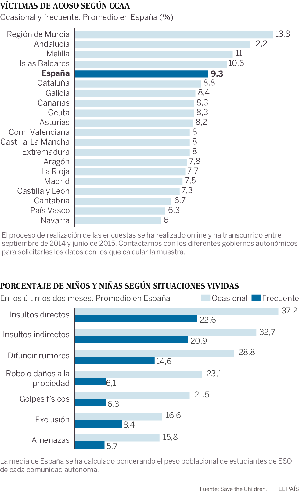 Estudios más recientes de entidades particulares elevan el porcentaje: uno de cada 10 niños asegura haberlo sufrido, según un informe de Save the Children. A ellas las acosan más, según otro trabajo de la Fundación Anar, que denuncia también cómo las redes sociales agravan el problema porque el ciberacoso permite ataques durante 24 horas al día y siete días a la semana. Frente a esto, las actuaciones del Gobierno se han producido movidas por acontecimientos dramáticos.