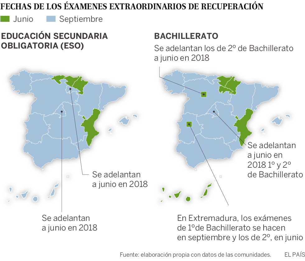Cuatro regiones (Navarra, País Vasco, Cantabria y Comunidad Valenciana) han fijado ya sus exámenes de recuperación en junio en la ESO. En Bachillerato los han adelantado Navarra, País Vasco y Comunidad Valenciana, además de La Rioja, Canarias y, en parte, Extremadura. Otras tres más (Madrid, Castilla y León y La Rioja) quieren adelantar sus propias pruebas a partir de 2018 aunque no en todos los cursos (ver gráfico). España, con unas tasas de repetición que la sitúan en cabeza de una poco honrosa lista de países de la OCDE, ha abierto el debate sobre cuándo es mejor examinar y por qué.