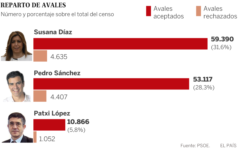 Concluida la verificación de los avales, Susana Díaz se impuso con una ventaja de 6.273 apoyos sobre Pedro Sánchez, ambos a mucha distancia de Patxi López. La ventaja de la presidenta andaluza fue, sin embargo, menor de la que esperaba su equipo. Los resultados definitivos quedan así: