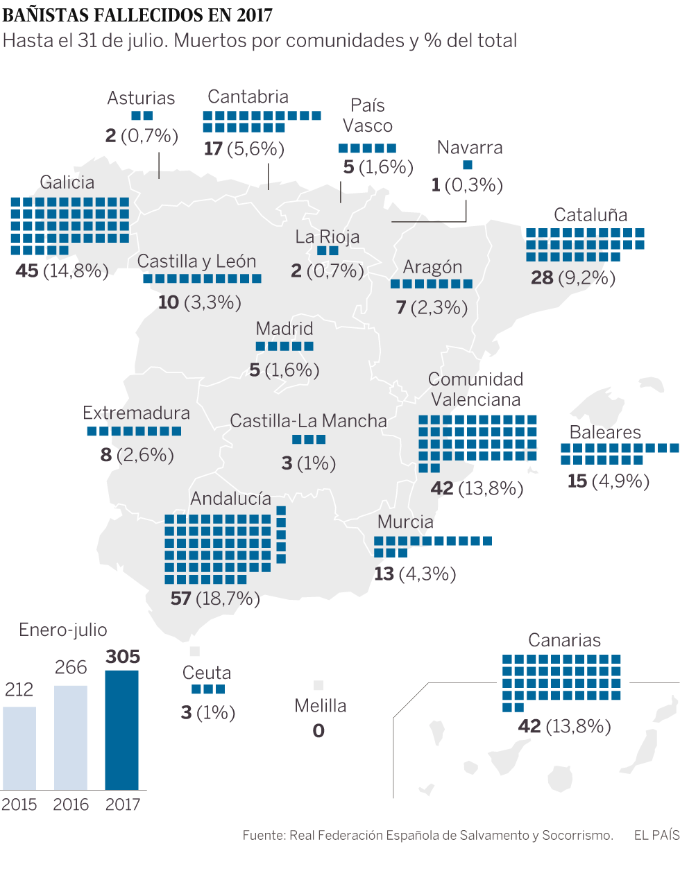 España tiene más de 7.900 kilómetros de costa. Andalucía, con unos 945, es la cuarta comunidad autónoma en extensión de litoral, pero es la primera por número de víctimas. Uno de cada cinco muertos se produjo en esta región, seguida de Galicia, con 45 ahogamientos y Canarias y Comunidad Valenciana, con 42 fallecimientos en cada una. "Solemos hacer una media de dos o tres rescates por semana. El problema que hay muchas veces es el atrevimiento y el desconocimiento de las condiciones de la playa", manifiesta Eduardo Rodríguez, socorrista en Sanlúcar de Barrameda, Cádiz.
