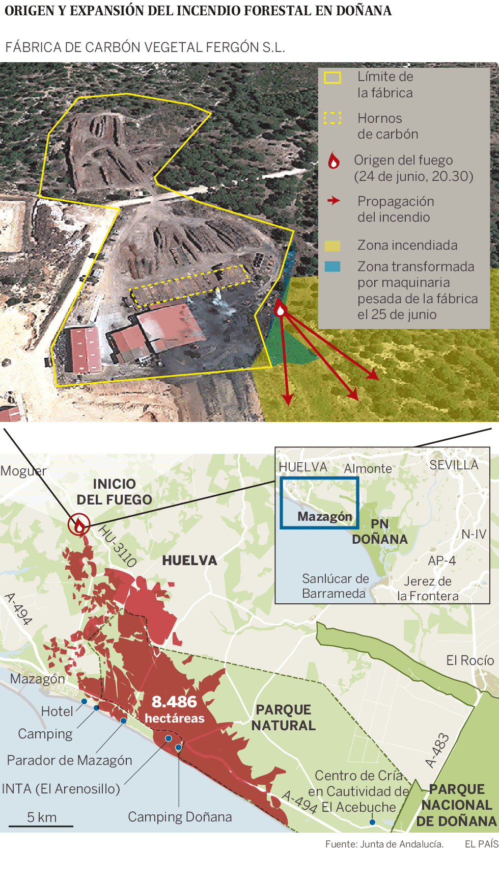Las primeras fotos aéreas tomadas poco después de saltar la alarma a última hora de la tarde del sábado 24 de junio ya señalaban hacia Carbones Fergón SL, la empresa productora de carbón vegetal ubicada en Moguer (Huelva), en mitad de una zona rústica próxima a Doñana. Y el informe de los agentes medioambientales de la Junta de Andalucía, de 116 páginas y al que ha tenido acceso Papallones, abunda en esa hipótesis.
