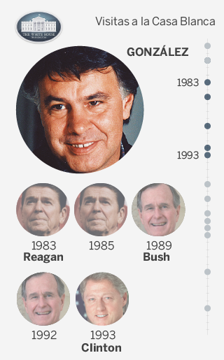 LATINOAMÉRICA Y BARCELONA 92: LOS DESPACHOS DE GONZÁLEZ La apertura española al resto del mundo, después de los años de dictadura franquista, le tocaron a Felipe González, que visitó el Despacho Oval en cuatro ocasiones. González se entrevistó con dos inquilinos de la Casa Blanca, Ronald Reagan y George H. W. Bush. En los más de 10 años de visitas del español le dio tiempo a servir como engranaje en las cuestiones latinoamericanas, invitar a Bush a los Juegos Olímpicos de Barcelona 92, discutir la manera de volver al crecimiento económico o charlar de política sanitaria con Hillary Clinton, antes de que esta dispusiese los adornos navideños.