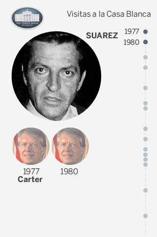 ADOLFO SUÁREZ Y LA NUEVA ESPAÑA DEMOCRÁTICA Adolfo Suárez visitó en un par de ocasiones a Jimmy Carter, en los que trató temas de actualidad en aquel momento, como la invasión soviética de Afganistán, las crisis de Irán o de Oriente Próximo.14/01/1980 | Carter y Suárez, partidarios de reforzar la seguridad occidental29/04/1977 | Carter se interesa por las elecciones españolas