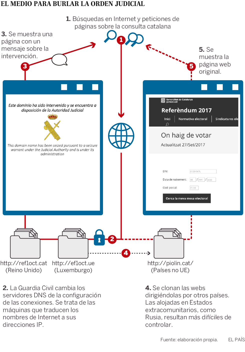 Tras el cierre de la primera web oficial del referéndum (referendum.cat) el presidente de la Generalitat, Carles Puigdemont, publicó en su Twitter dos direcciones nuevas: ref1oct.cat y ref1oct.eu, ubicadas en Reino Unido y Luxemburgo. Ambas fueron cerradas inmediatamente por orden judicial. Los hackers al servicio de la Generalitat clonaron la página web y activaron nuevas direcciones en Europa, lo que le ha permitido a la Guardia Civil intervenir también los dominios referendum.ninja, referendum.love o guardiacivil.sexy. Tras replicar los dominios en Europa, ahora los aliados del procés se han lazando a hacerlo en Rusia y Asia Central.