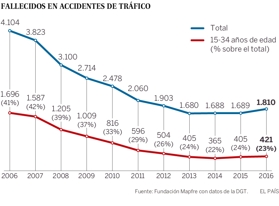 Pese a las buenas cifras, los datos de los últimos dos años indican un repunte de la siniestralidad al volante. Entre 2014 y 2016, las muertes de jóvenes en accidentes de tráfico aumentaron un 15%, de 365 a 421.