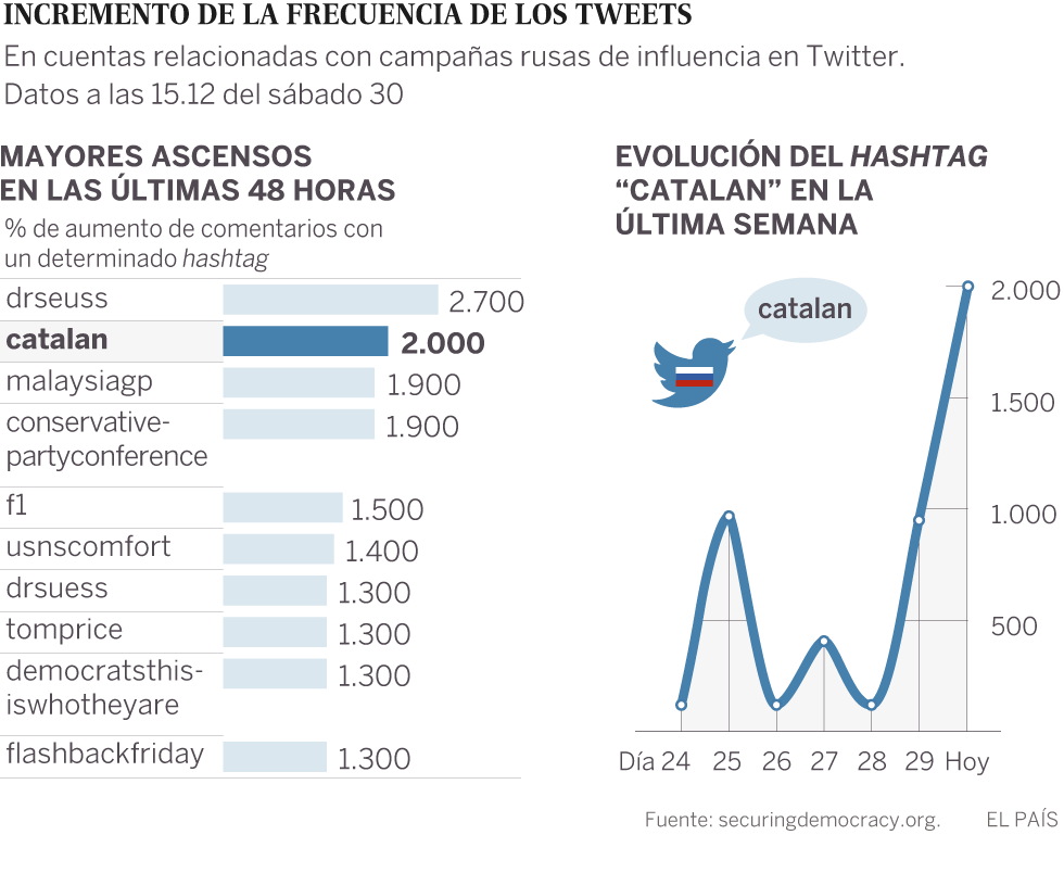 La maquinaria de injerencia rusa ha redoblado sus esfuerzos en redes sociales para ahondar las divisiones en las horas finales del pulso independentista. Los perfiles afines al Kremlin en Twitter incrementaron ayer un 2.000% sus menciones a la crisis catalana, según herramientas de análisis de la conversación social en Internet. El intento de referéndum de independencia ha logrado un tratamiento estelar no sólo en las cadenas que financia directamente el Gobierno ruso, sino también en medios dados a todo tipo de teorías de la conspiración que hace un año auparon a Donald Trump a la presidencia de Estados Unidos.
