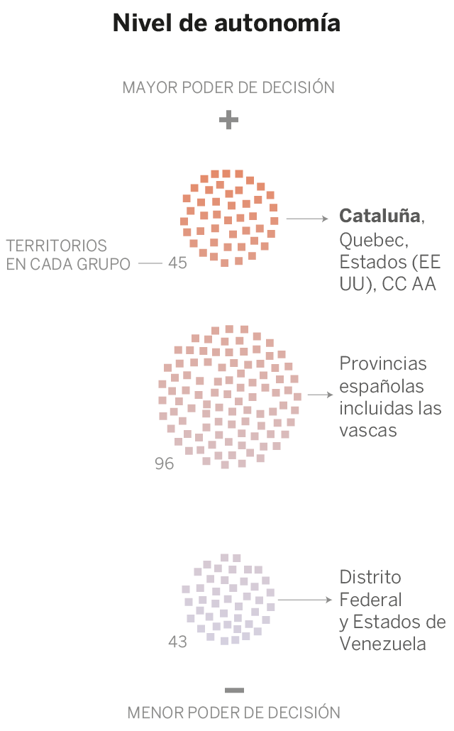 Cómo leer los gráficos. Las dos infografías inferiores clasifican las entidades territoriales en los niveles determinados por el estudio. En cuanto al nivel de autonomía, Cataluña aparece en el grupo superior, en el que se incluyen 45 entidades y que conlleva un mayor poder de decisión. No es el más numeroso, pues el nivel intermedio cuenta con 96, entre las que se incluyen las provincias españolas incluidas las vascas. El grupo que dispone de menor poder de decisión está formado por 43 entidades, como los Estados de Venezuela.