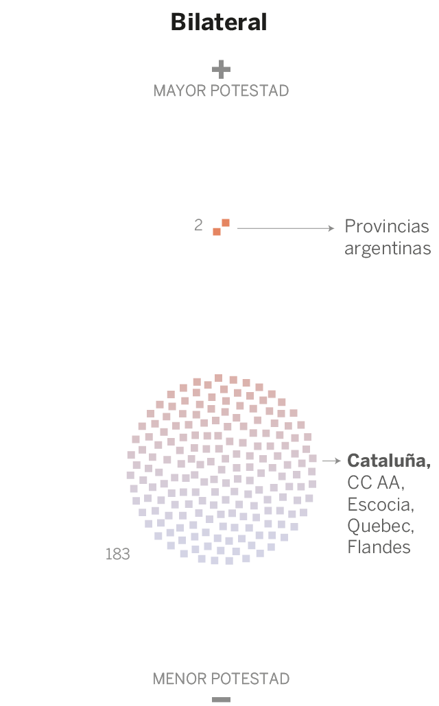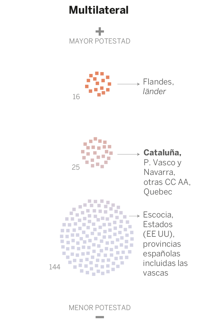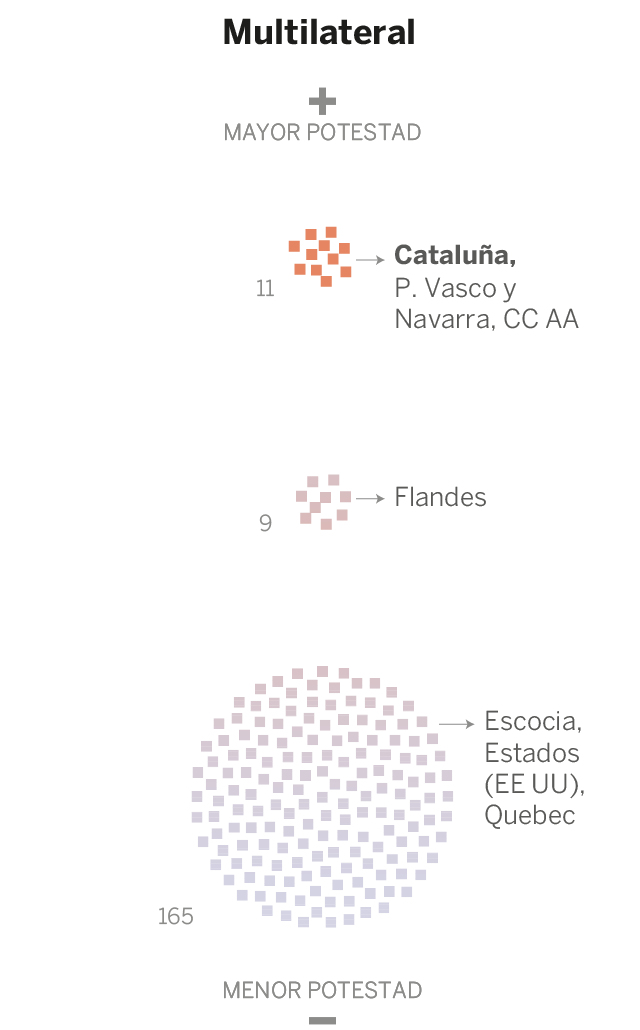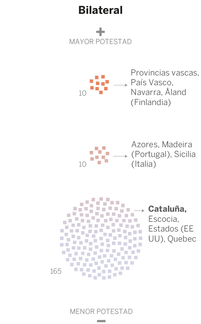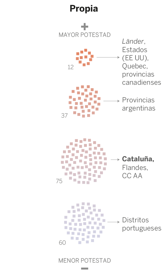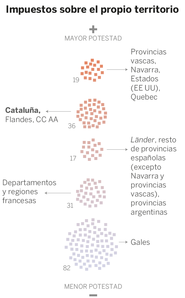 Cómo leer los gráficos. La infografía inferior clasifica las entidades territoriales en los niveles determinados por el estudio. En cuanto a los impuestos sobre el territorio propio, Cataluña aparece en dicho segundo grupo, en el que se incluyen 36 entidades y que conlleva cierta potestad. No es el conjunto más numeroso, pues el nivel que supone menor potestad sobre estos gravámenes incluye 82 entidades, entre las que se incluye Gales.