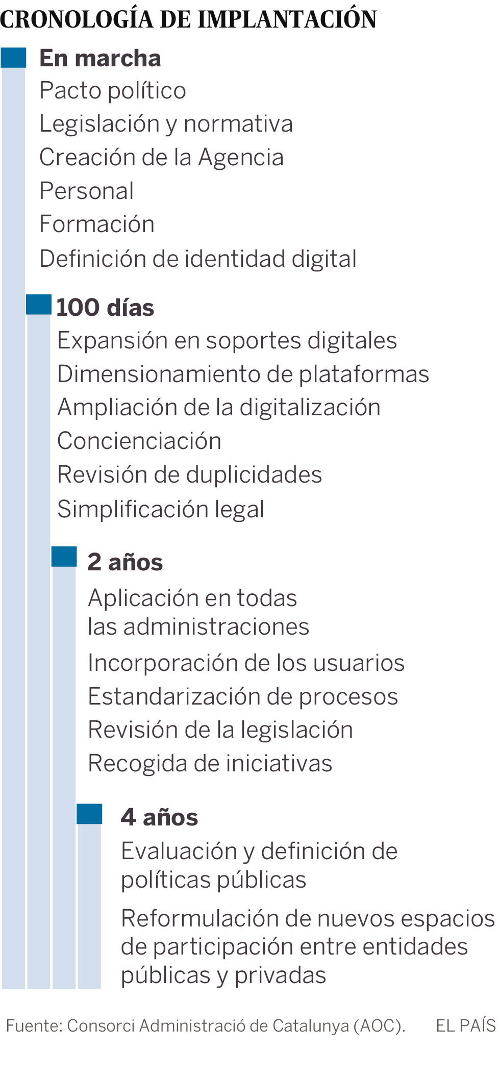 Aunque el presidente Carles Puigdemont dejó en suspenso la independencia después de declararla en el Parlamento autonómico el martes, su Gobierno sigue trabajando a pleno rendimiento para hacer de la desconexión una realidad. Los líderes independentistas piden ahora mediación internacional con la intención de dialogar en paridad con el Gobierno español mientras buscan una política de hechos consumados. Uno de esos hechos consumados es la estructura íntegra del Estado en el entorno digital. Sus principales pilares son un registro civil, un sistema de identificación digital para trámites burocráticos en la república catalana y un portal bajo el dominio gov.cat.