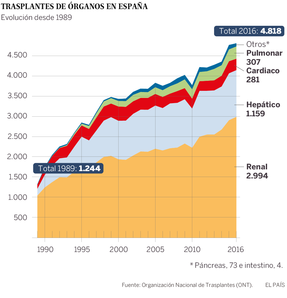 Sin embargo, a pesar de las cifras récord, Domínguez asegura que aún hay margen para la mejora. “Estamos trabajando en la colaboración con las unidades de urgencias. Pensamos que tiene más recorrido”, explica. De momento, los números registrados en los primeros meses del año apuntan a que 2017 será otro año de récord: entre enero y mayo, los trasplantes aumentaron un 11,5%, según datos de la ONT.