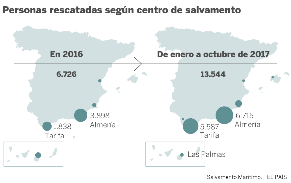 Según datos del Ministerio del Interior, en los primeros diez meses del año intentaron entrar por mar 16.010 personas de manera irregular; en el mismo periodo de 2016 fueron 6.556. El aumento es de 144% en un solo año. De ellos, las rescatadas por Salvamento Marítimo han sido 13.544 personas, y en todo 2016 fueron aproximadamente la mitad: 6.726.