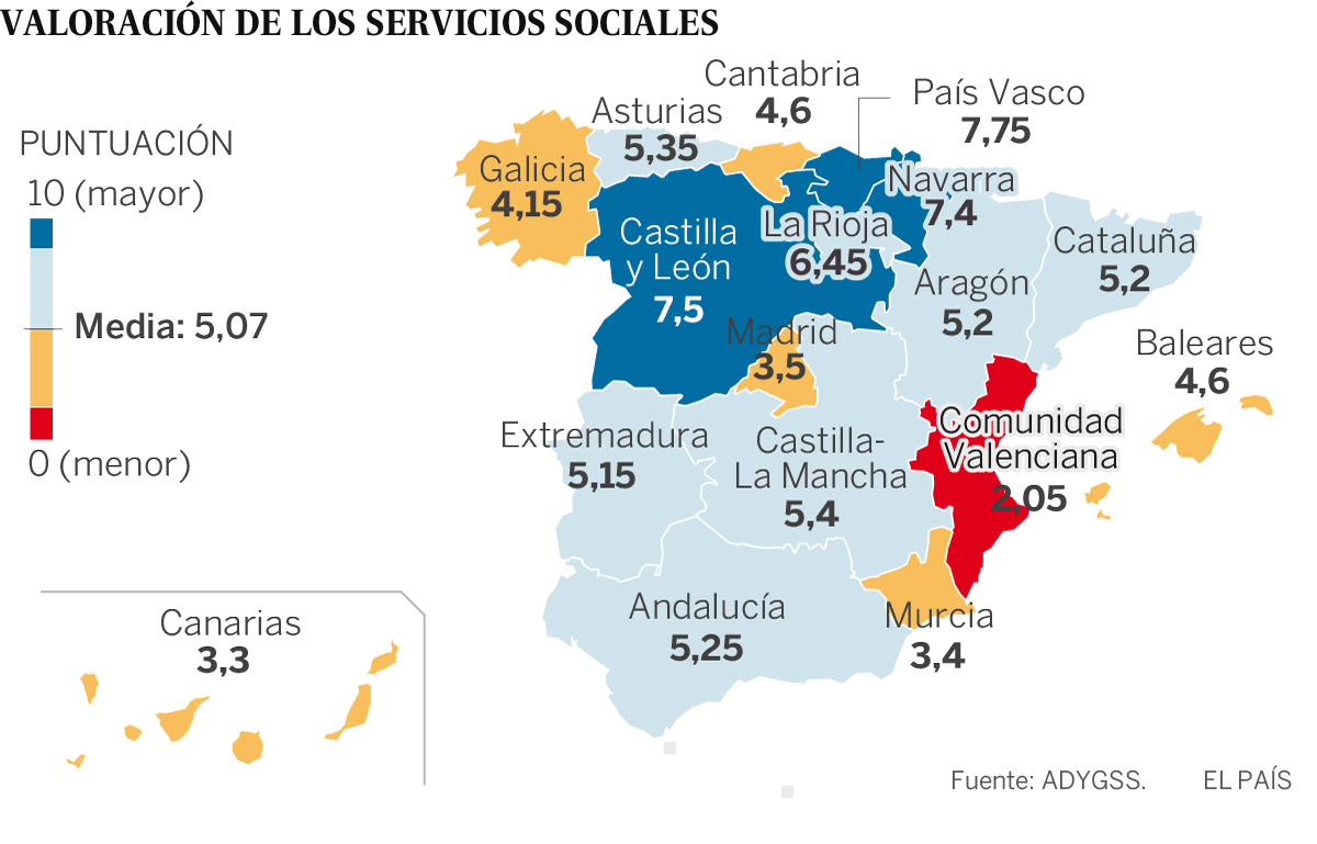 La buena noticia sobre la situación de los servicios sociales en España, que atienden a ocho millones de españoles, es que al cierre de 2017 se espera que se haya recuperado la inversión de 2010, cuando empezaron los recortes. La nota media de las comunidades autónomas ha mejorado 0,54 puntos desde 2015 y consigue superar el aprobado, con 5,08 puntos sobre 10, según el Índice de Desarrollo de los Servicios Sociales (DEC), desarrollado por la Asociación de Directoras y Gerentes de Servicios Sociales de España (ADYGSS). La mala noticia es que sigue habiendo grandes disparidades entre comunidades autónomas: País Vasco y Navarra son las que mejor nota sacan (7,75 y 7,50) frente a Comunidad Valenciana y Canarias, con un 2,5 y un 3,3 respectivamente.